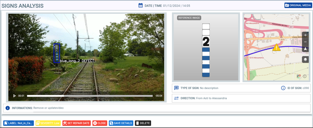 The system automatically detects the presence and condition of railway signs, identifying: