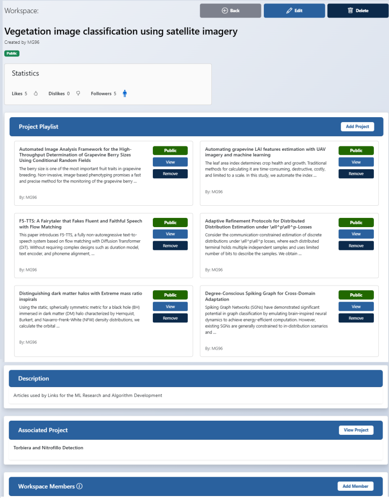 A Workspace acts as a collaborative “research desk,” where users can group and organize multiple projects under a common theme.