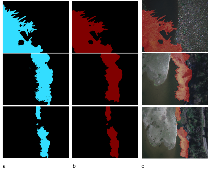 a – dati rilevati in campo, b – predizione del modello, c – sovrapposizione