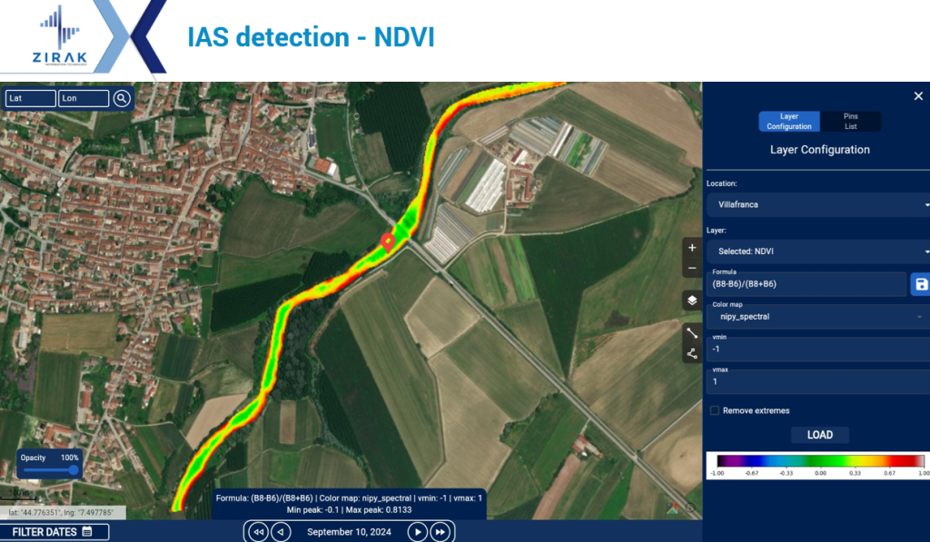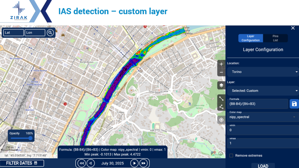 Tools to configure desired indices and bands, defining custom formulas, adjusting minimum/maximum values and selecting colour maps.
