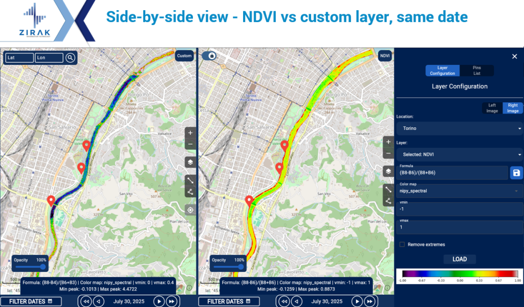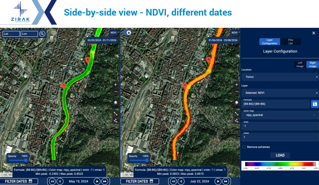 The interface also offers side-by-side comparison of geospatial data, enabling the analysis of temporal variations, differences between two datasets, and the comparison of different indices on the same dates or at different points in time.